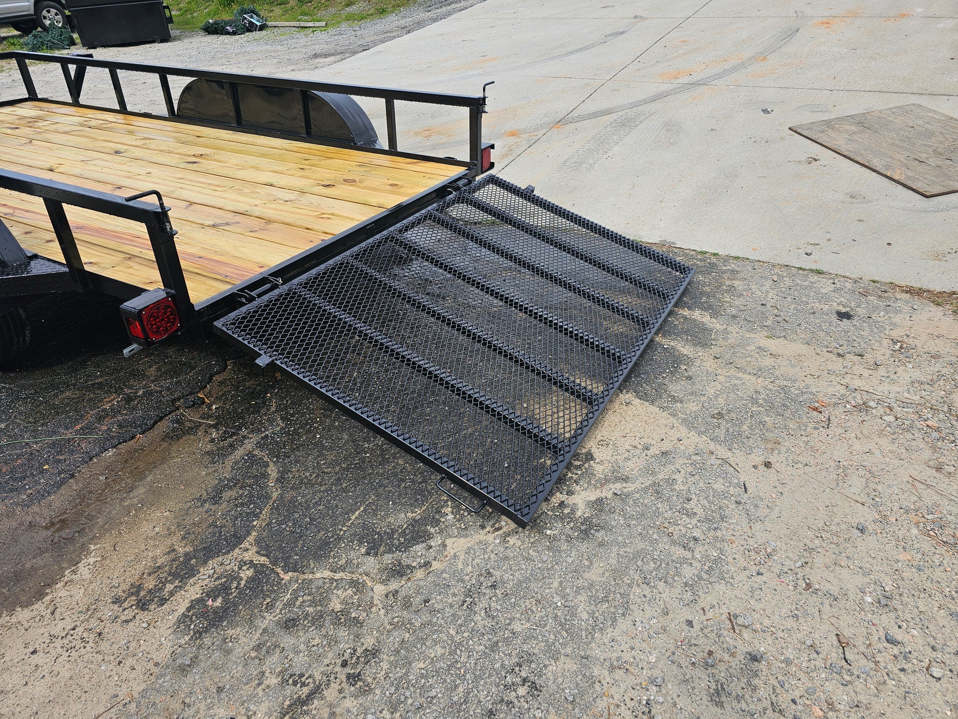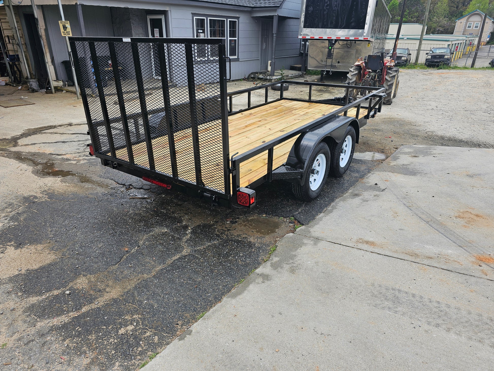 14' utility trailer 15" tires, spare tire holder, 4' gate with spring assist, wood floor, L.E.D light to DOT specifications, square tubing top rail and uprights, 4 wheel brakes and DOT required breakaway kit.