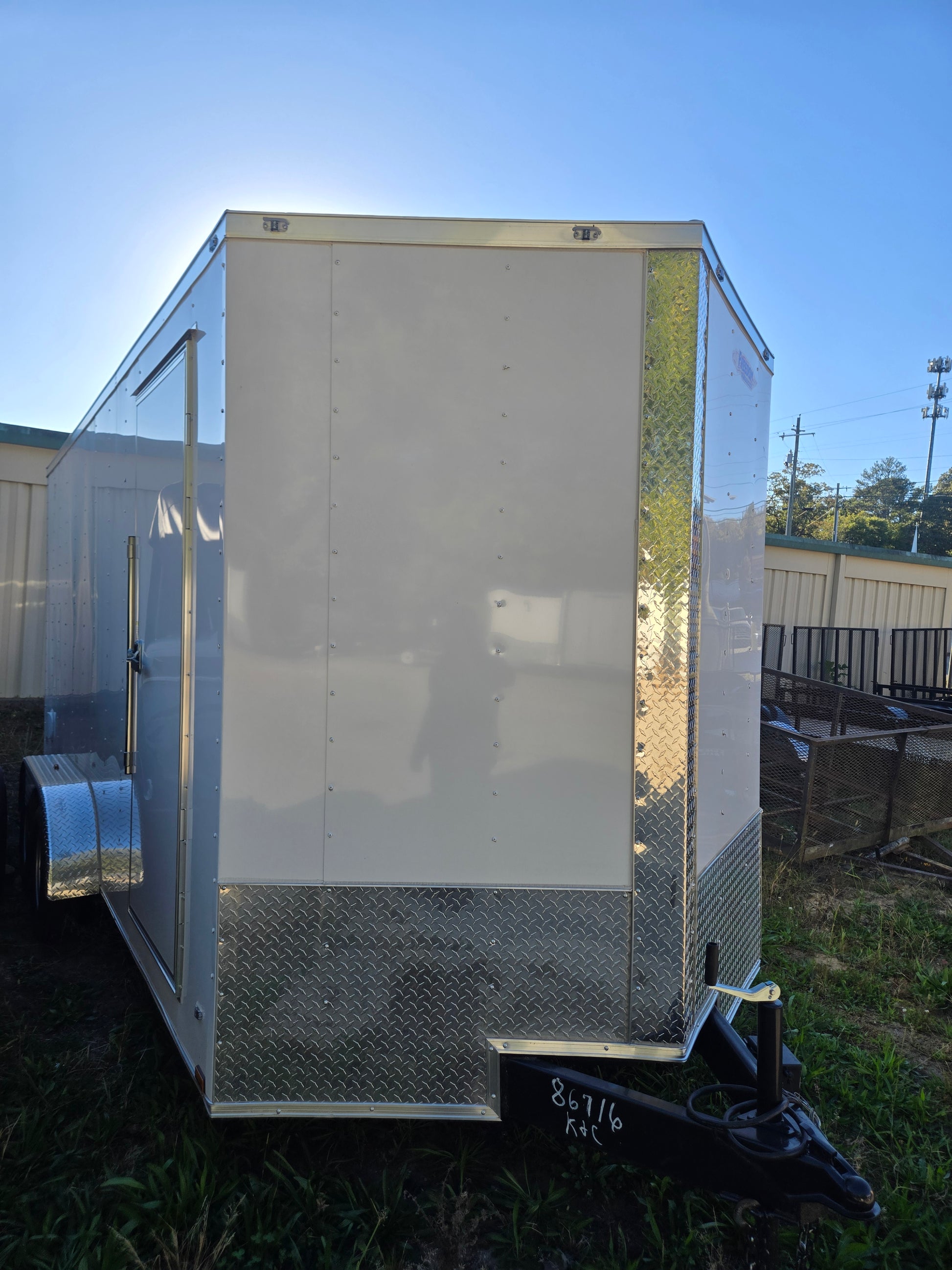 Enclosed Trailer with polycore siding, 7,000# GVW, 15" tires, drop axle, 4 wheel brakes, side door, ramp door, hard top roof, L.E.D lights, 7' interior height, and V-nosed front.